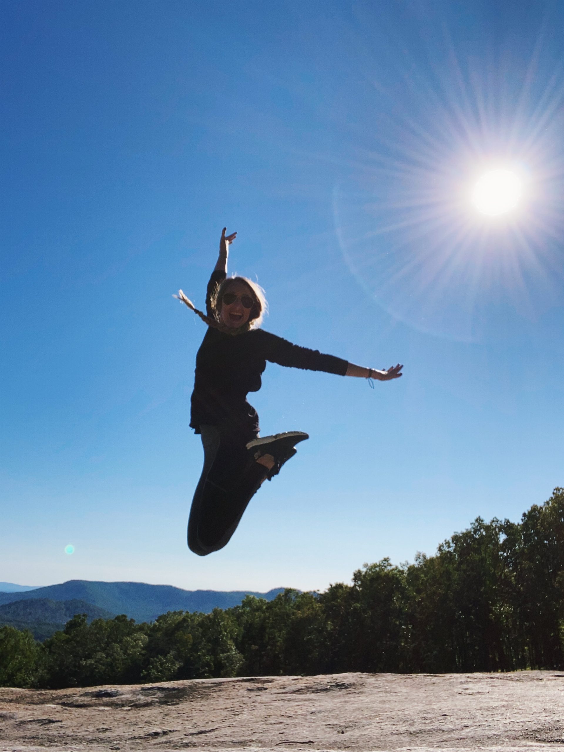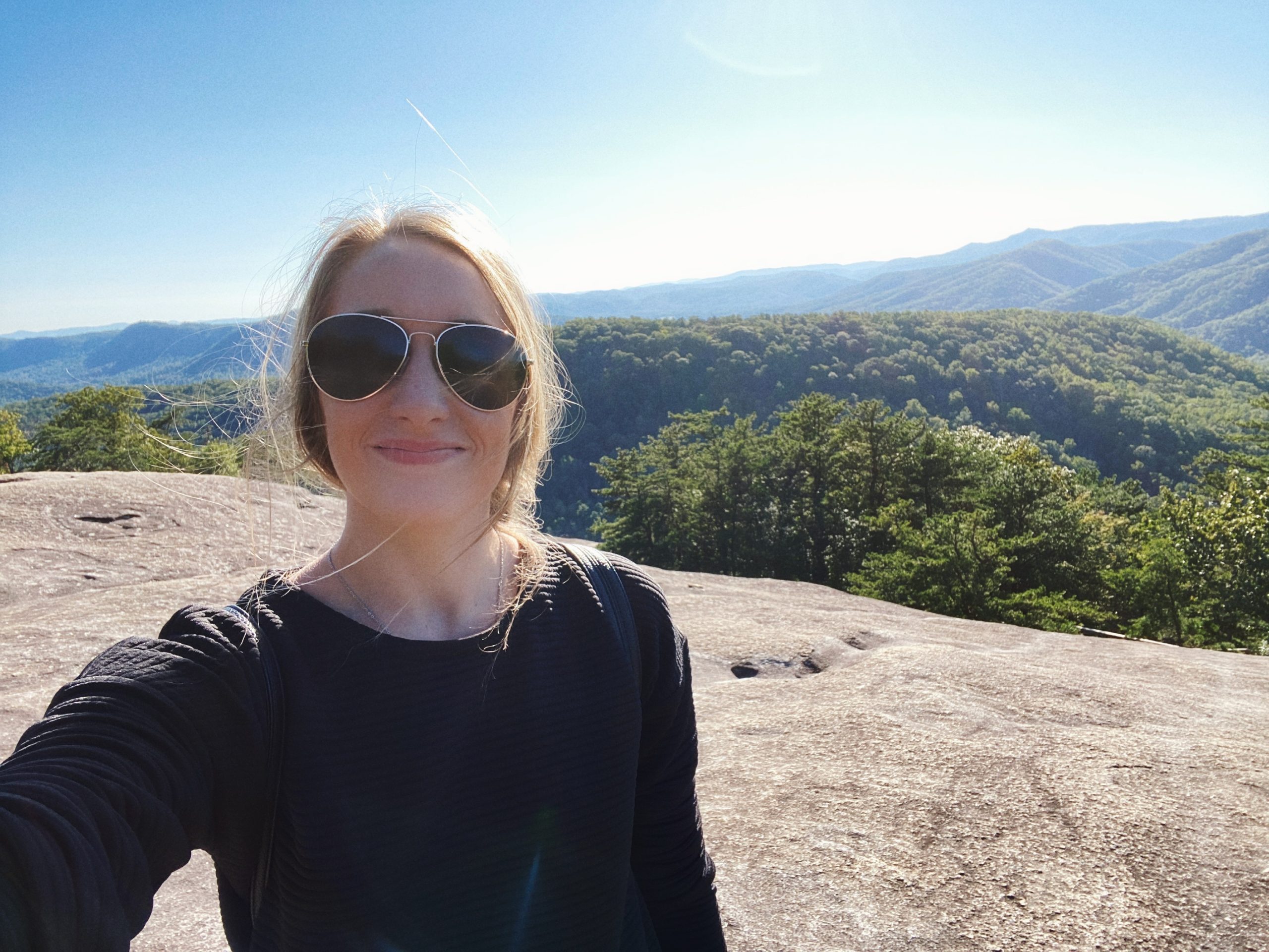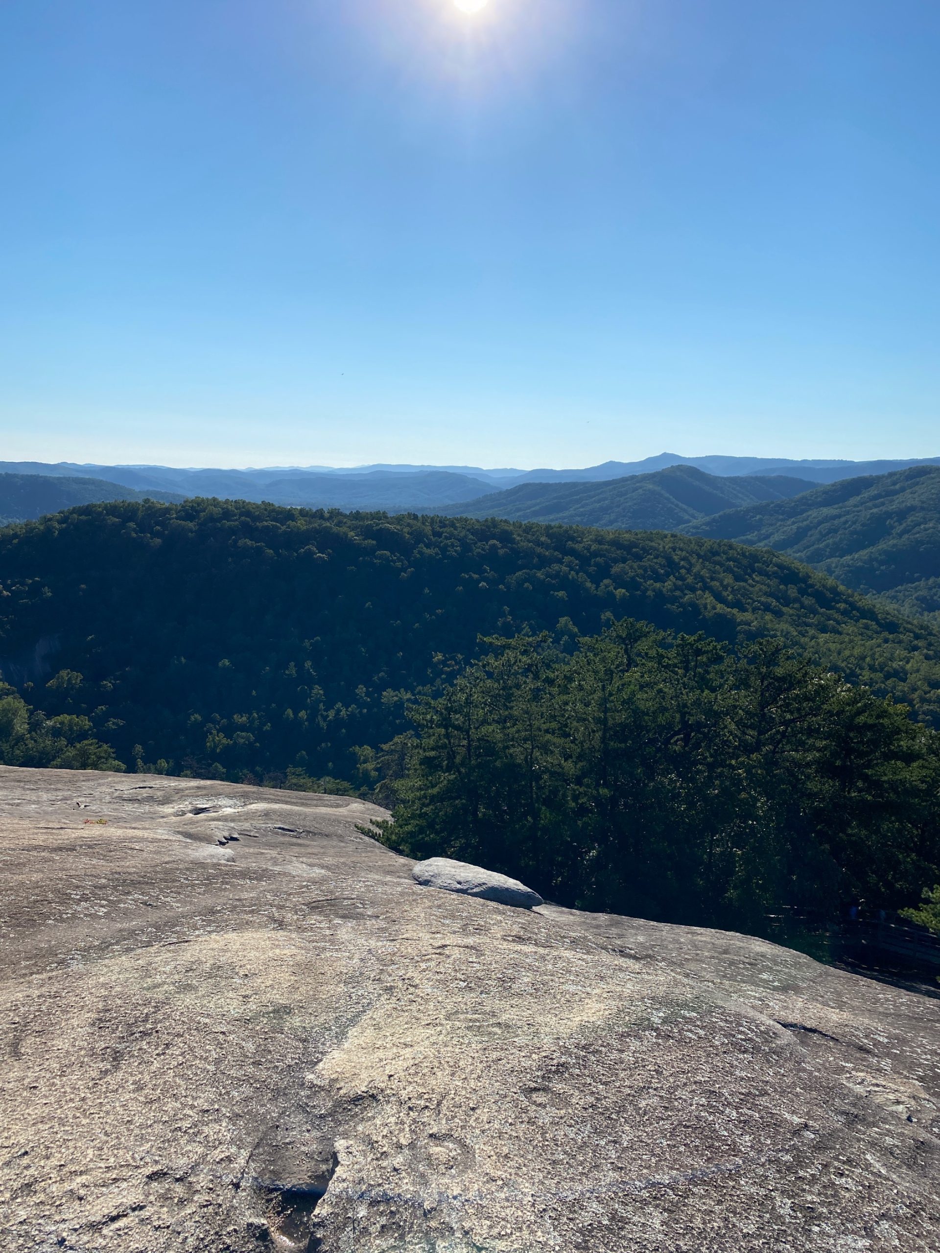 I then proceeded on my adventure. After walking up over 300 stairs, I reached the top of the waterfall and went left, continuing on the Loop Trail to reach the Stone Mountain summit. The trail switches back to a gravel trail (some roots) and eventually opens up to a Blue Ridge Mountain View. I stopped here to eat my sandwich and have a little photo op. I think one of my favorite parts about this park was how the rocks on top of the mountain looked like moon craters. They were so much fun to play on.