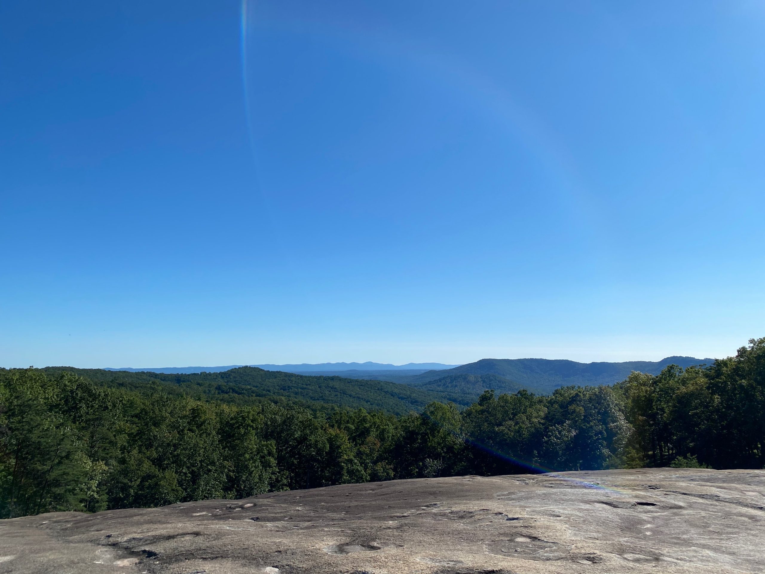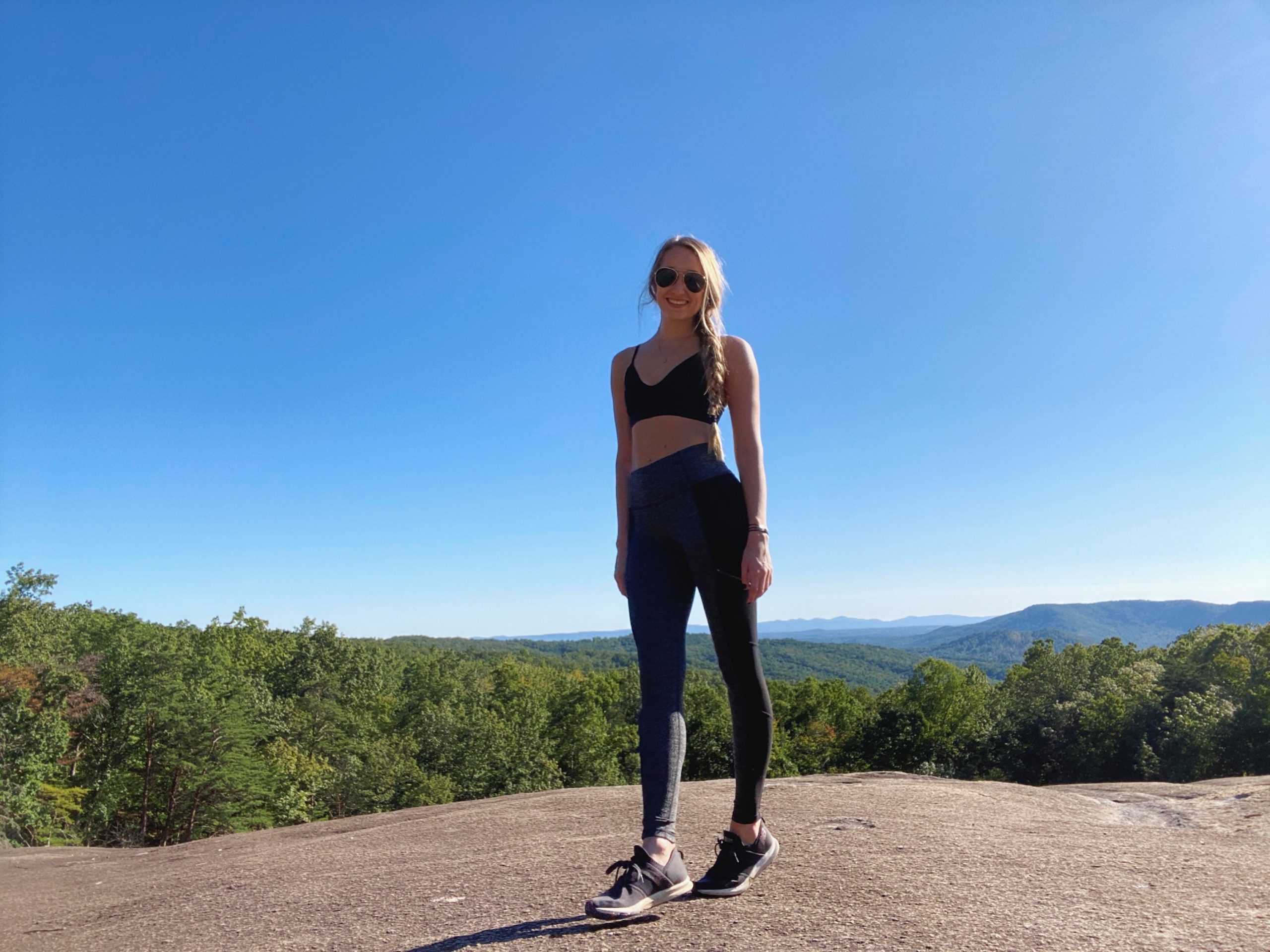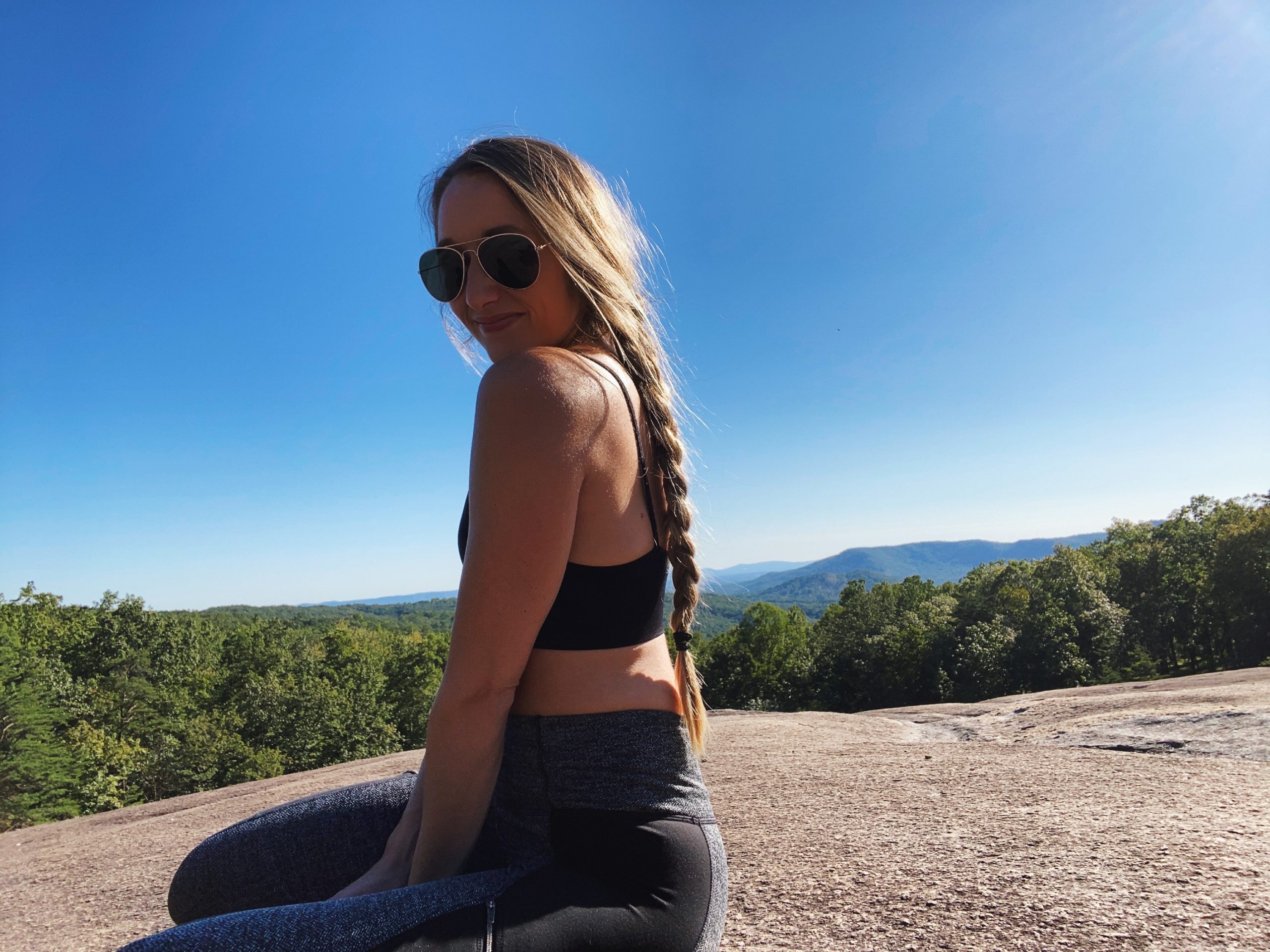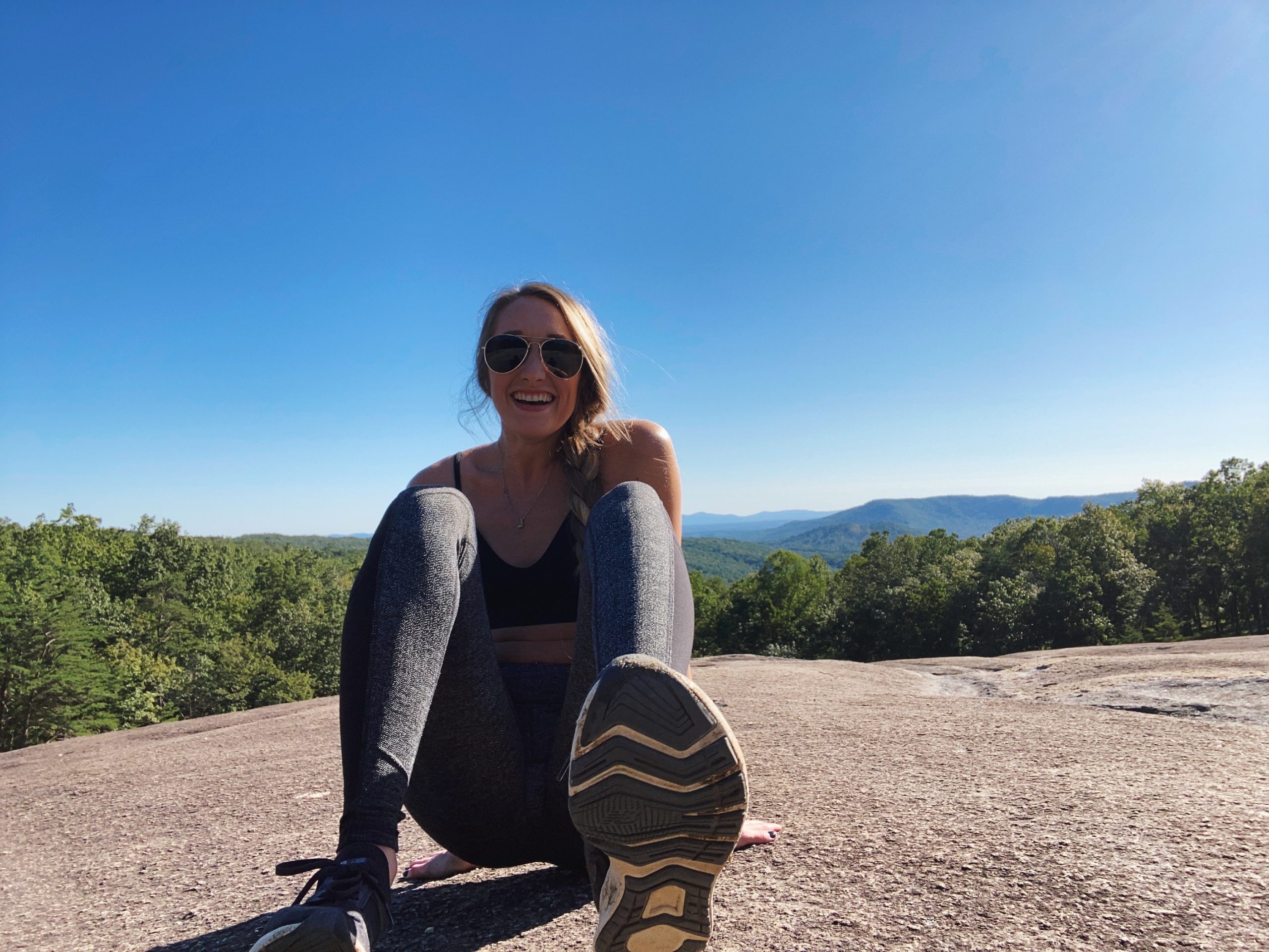 I then proceeded on my adventure. After walking up over 300 stairs, I reached the top of the waterfall and went left, continuing on the Loop Trail to reach the Stone Mountain summit. The trail switches back to a gravel trail (some roots) and eventually opens up to a Blue Ridge Mountain View. I stopped here to eat my sandwich and have a little photo op. I think one of my favorite parts about this park was how the rocks on top of the mountain looked like moon craters. They were so much fun to play on.